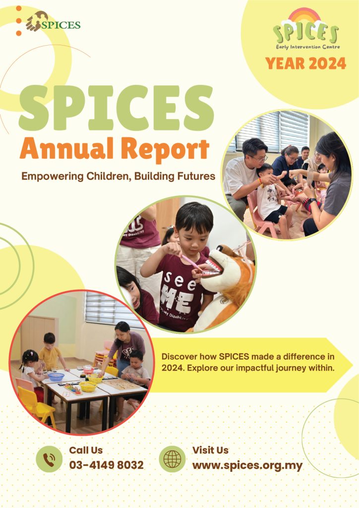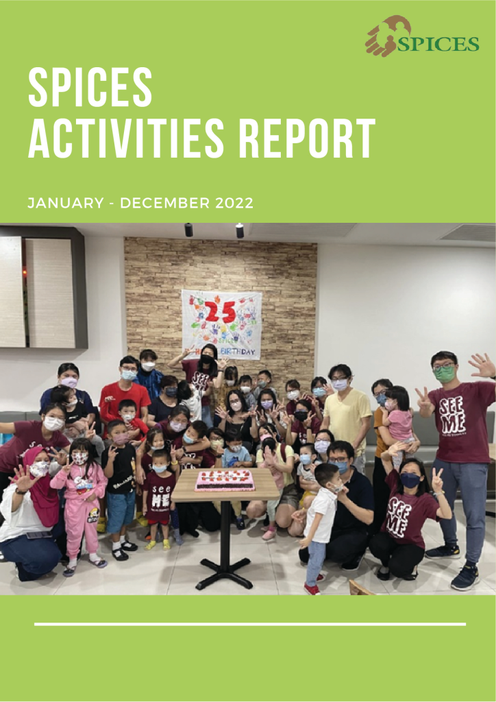 Annual Reports Annual Report 2024 Annual Report 2023 Annual Report 2022 News Learn More SPICES Newsletter Apr – Aug 2021 News Learn More SPICES Newsletter Jan – Apr 2021 News Learn More SPICES Newsletter Nov – Dec 2020 News Learn More SPICES Newsletter July – October 2020 News Learn More SPICES Newsletter Charity Golf 2019 Special Edition News Learn More SPICES Newsletter May – August 2019 News Learn More SPICES Newsletter September – December 2018 News Learn More SPICES Newsletter May – August 2018 News Learn More SPICES Newsletter January – April 2018 News Events Learn More Foodie's Gift for SPICES Events Learn More Thank You Extra Space Asia Self Storage! Events Learn More World Play Day 2019 Events Learn More Sibling Camp & Parent Forum Events Learn More Would you like to take a swing for Charity? Events Learn More Boundaries Workshop Events Learn More World Play Day Events